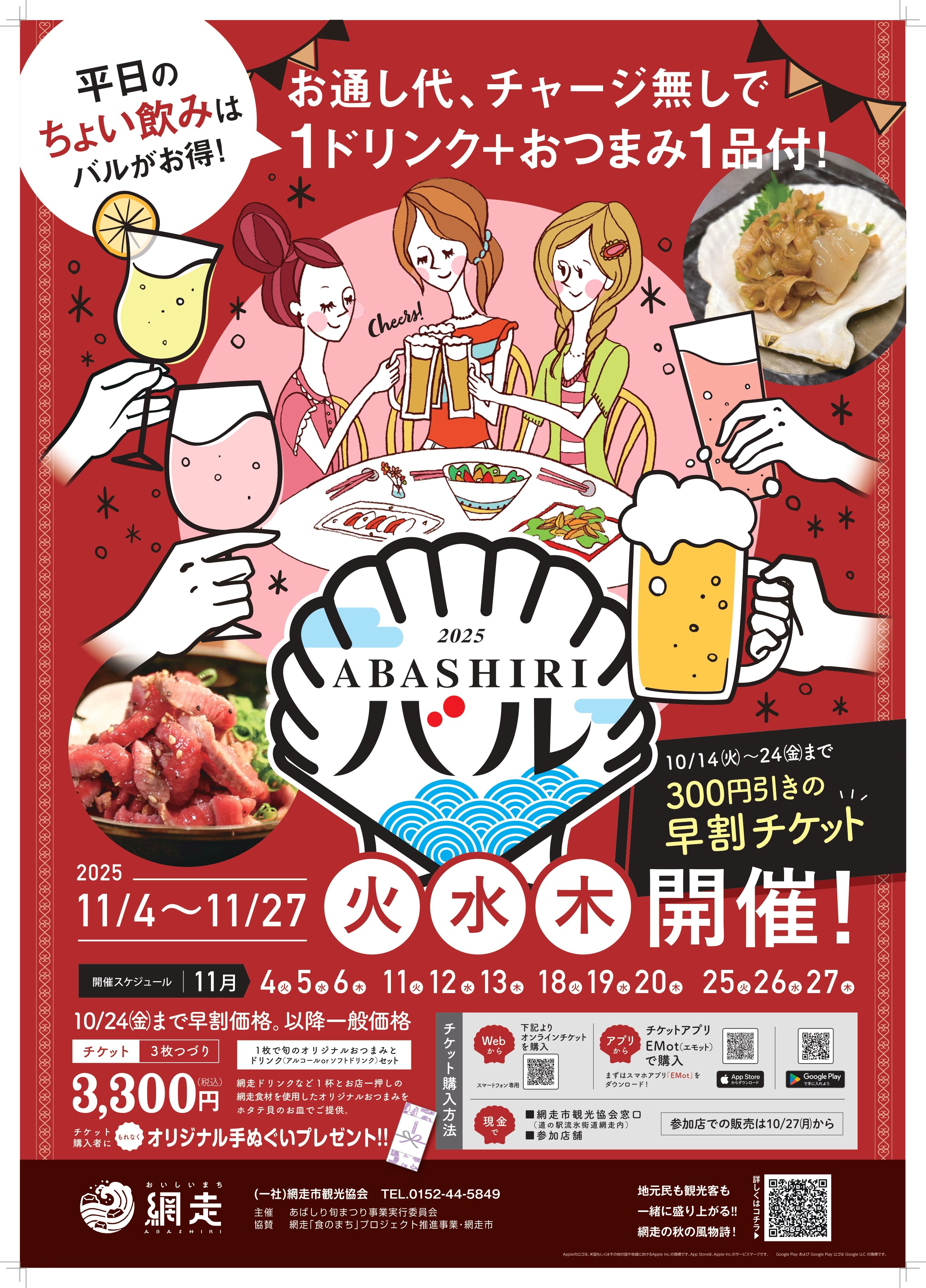 2025.10.08 NEW 体験・イベント お知らせ 2025ABASHIRI【週ナカ】バル 早割チケット販売 10/14~ 2025/10/14~早割300円OFFチケット販売開始! デジタルチケットでスマートフォン専用紙チケットで1.左のQRコードからGoogleフォームにてお申込み2.TELまたは直接窓口にて思う押し込み紙チケット受取は10/25~道の駅流氷街道内 観光案内所で開始となります。 関連リンク https://visit-abashiri.jp/event/372602d77bad6f97cc8e3130bbcb49b1a2826460.html