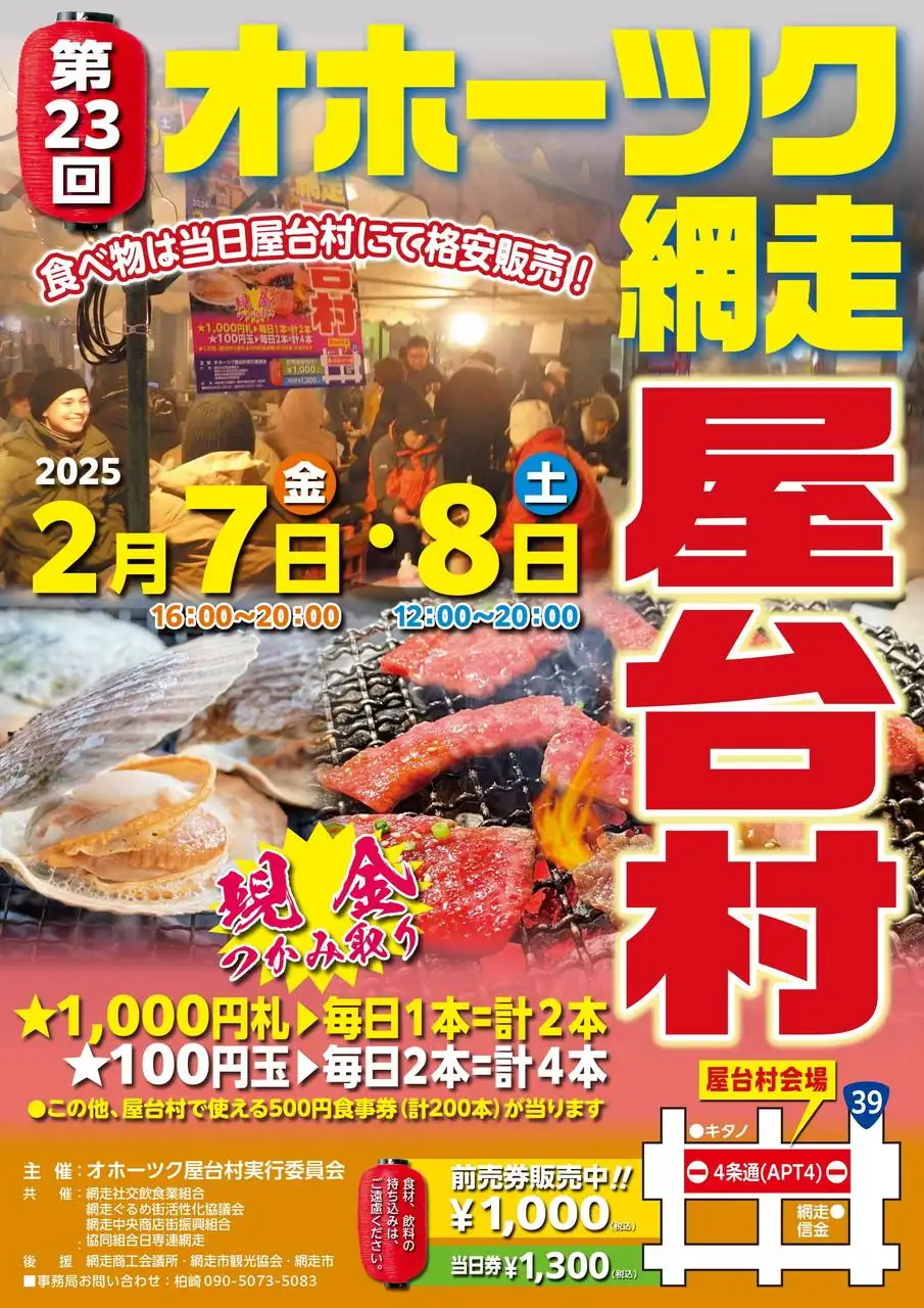 2月7日(金)から2月8日(土)まで、極寒の中アツアツのおいしい焼肉や海の幸、温かい網走ちゃんぽんやラーメンなどを楽しめるあばしりオホーツク屋台村が開催されます。氷で作ったテーブルが目を引く「アイス・バー」では氷のグラスで提供されるカクテルやジュースを楽しむこともできます。網走にお越しいただいたお客様は、ぜひご参加ください。