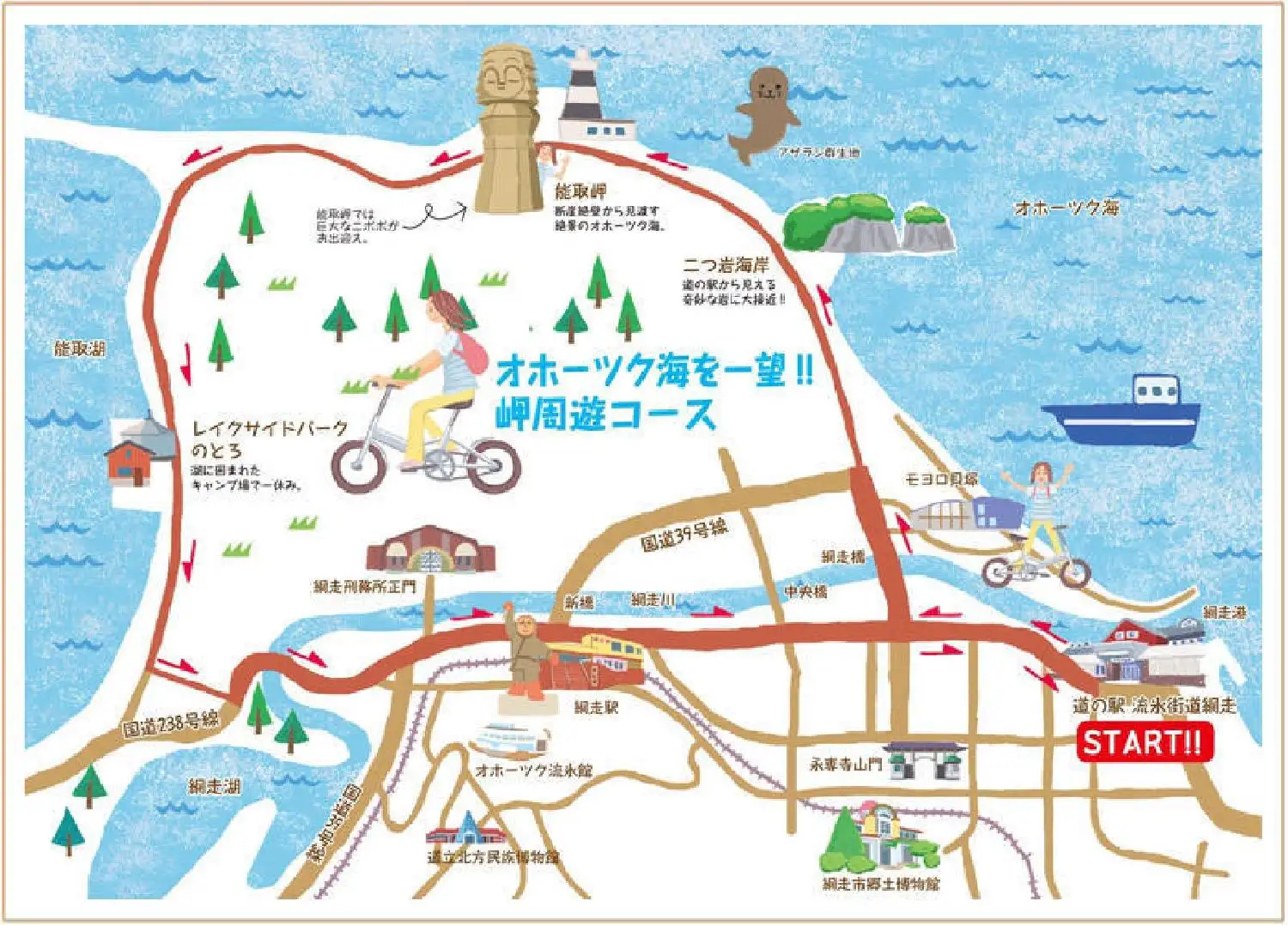 オホーツク海を一望!!岬周遊コースは、二つの岩を近くで見られる「二つ岩海岸」、感動の絶景「能取岬」などオホーツク海を一望できます。