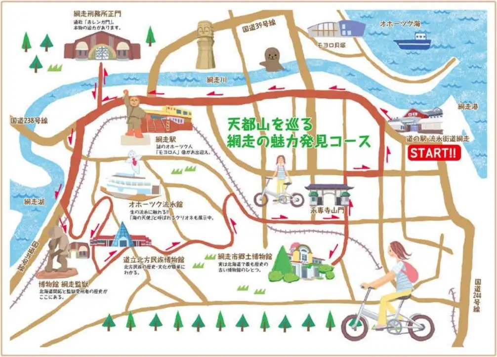 道の駅「流氷街道網走」観光案内所では、自転車の貸し出しも行なっています。シティサイクル、クロスロードバイク、電動アシスト付き自転車など、様々な種類の自転車をレンタルしており、おすすめサイクリングコースも紹介しています。