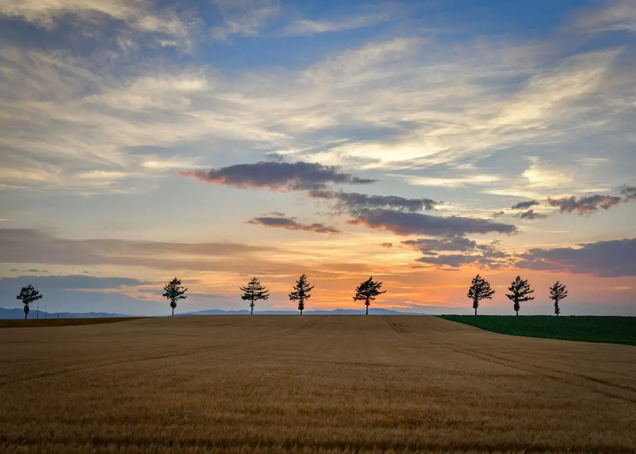 女満別空港と網走の間にある大空町のメルヘンの丘。広大な畑、その丘の上に並ぶ8本のカラマツは北海道らしい写真映えする観光スポットの一つです。日中の青空を背景にした景色、そして夕焼け空に木々のシルエットが浮かび上がる黄昏時も素敵です。