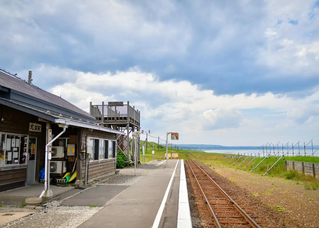 7月に入るとエゾキスゲが満開になり、その間を釧網本線がトコトコと走り抜けます。そしてオホーツク海に一番近い駅、北浜駅に到着します。木造の素朴な雰囲気を醸し出す駅舎の中に入ると、いつからか名刺が貼られるようになり、今では無数の名刺を見る事ができます。